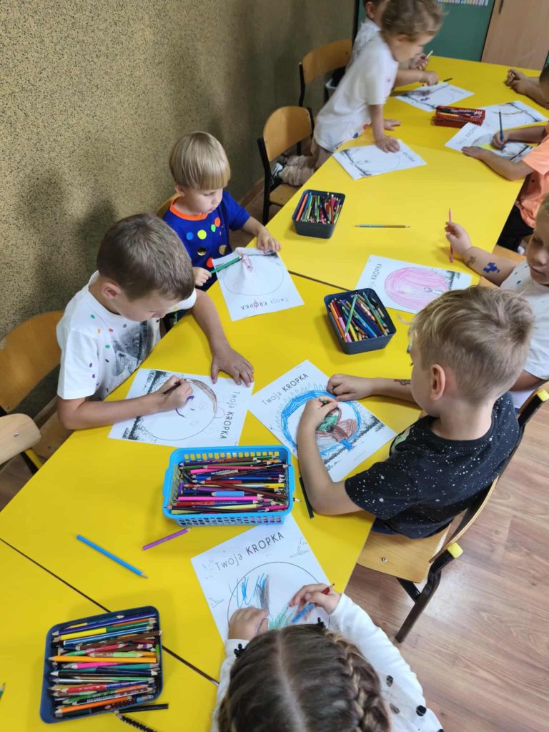 Dzieci w tym dniu przyszły ubrane w rzeczy ozdobione kolorowymi kropkami i z radością uczestniczyły w kreatywnych zajęciach. Przedszkolaki uważnie wysłuchały opowiadania „Kropka” Petera H. Reynoldsa. Rozmawialiśmy o tym, że każdy z nas posiada wyjątkowy talent, a nawet maleńka kropka może stać się początkiem wielkich rzeczy. Wykonaliśmy piękne prace plastyczne z wykorzystaniem kropek ulepionych z plasteliny. Następnie pobudziliśmy naszą wyobraźnię i narysowaliśmy świat w kropce. Na zakończenie czekały na nas zajęcia z kodowania. Był to dzień pełen radości i uśmiechu. Dzięki temu wielu z nas poznało swoje talenty i nabrało większej pewności siebie.