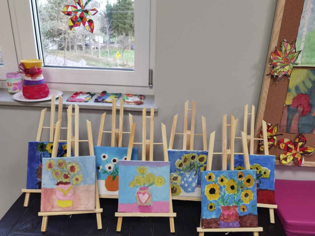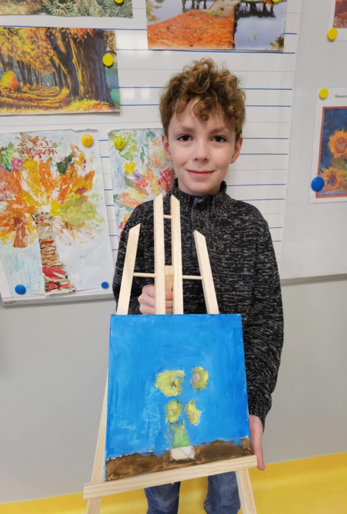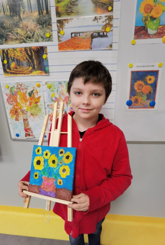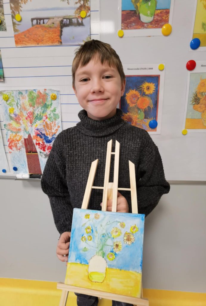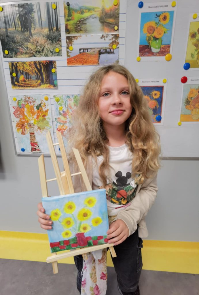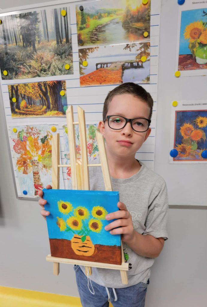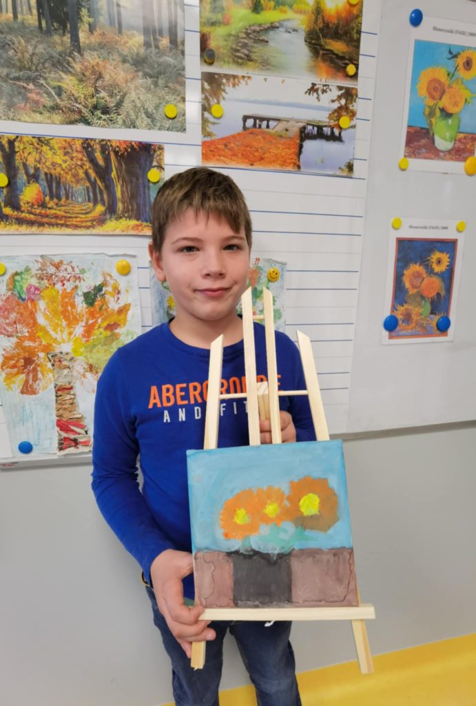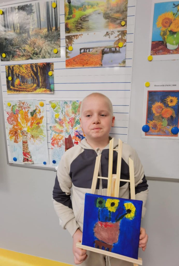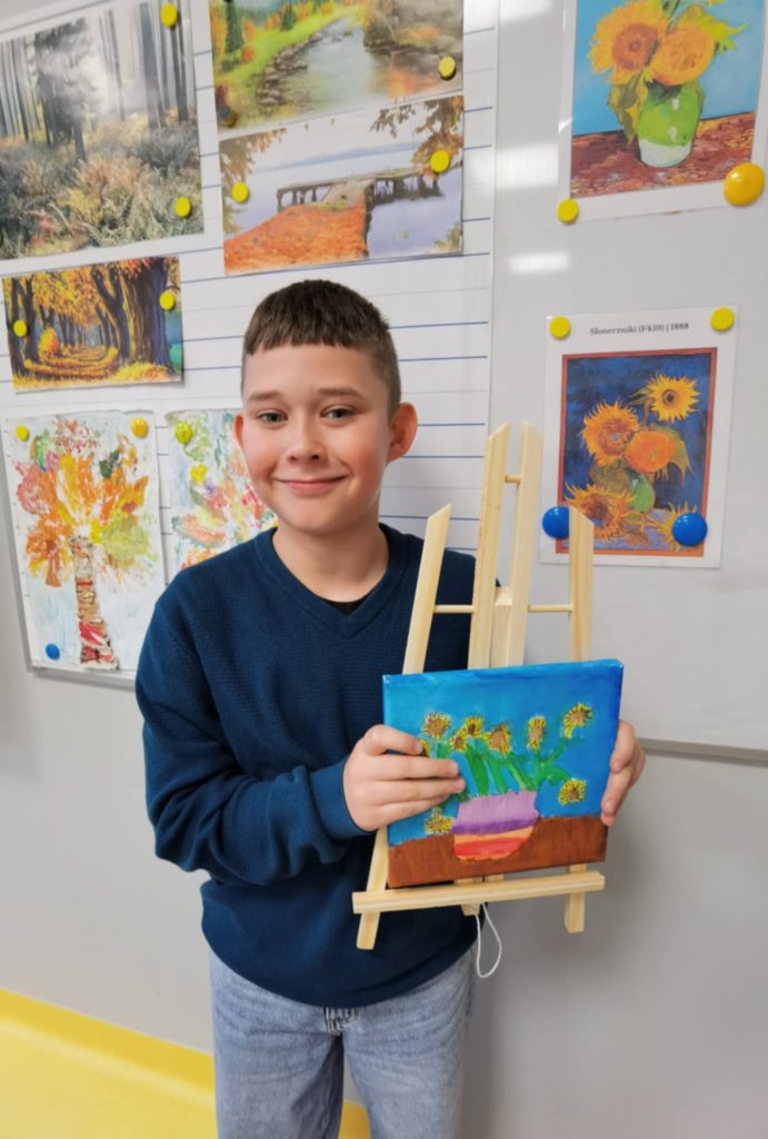 Obrazy Vincenta van Gogha cieszą się ogromnym zainteresowaniem wśród trzecioklasistów, zwłaszcza ,,Gwiaździsta noc” oraz ,,Słoneczniki”. Uczniowie z wielkim zaangażowaniem i artystycznym rozmachem malowali na płótnie kompozycje kwiatowe wzorując się na słynnych ,,Słonecznikach” tego wielkiego malarza. Poprzez plastyczne działanie uczniowie wyrabiają nawyk dbałości o estetykę wykonanych prac, uczą się ich właściwego eksponowania. Zajęcia o charakterze artystycznym znacząco budzą wrażliwość estetyczną dzieci i umiejętność dostrzegania piękna w wytworach kultury, usprawniają manualnie, ćwiczą kreatywne myślenie celem rozbudzania ekspresji twórczej ucznia, wyrabiają umiejętność wyrażania swoich myśli i uczuć w formie prac plastycznych, wzmacniają wiarę w swoje możliwości. Każde dziecko przychodzi na świat z pewnym potencjałem uzdolnień. To od nas zależy, ile zrobimy by „oszlifować ten diament” i wyciągnąć z niego to, co najlepsze. Sztalugi i podobrazia zostały ufundowane przez panią Agnieszkę Musielę, której składamy serdeczne podziękowania!!!
