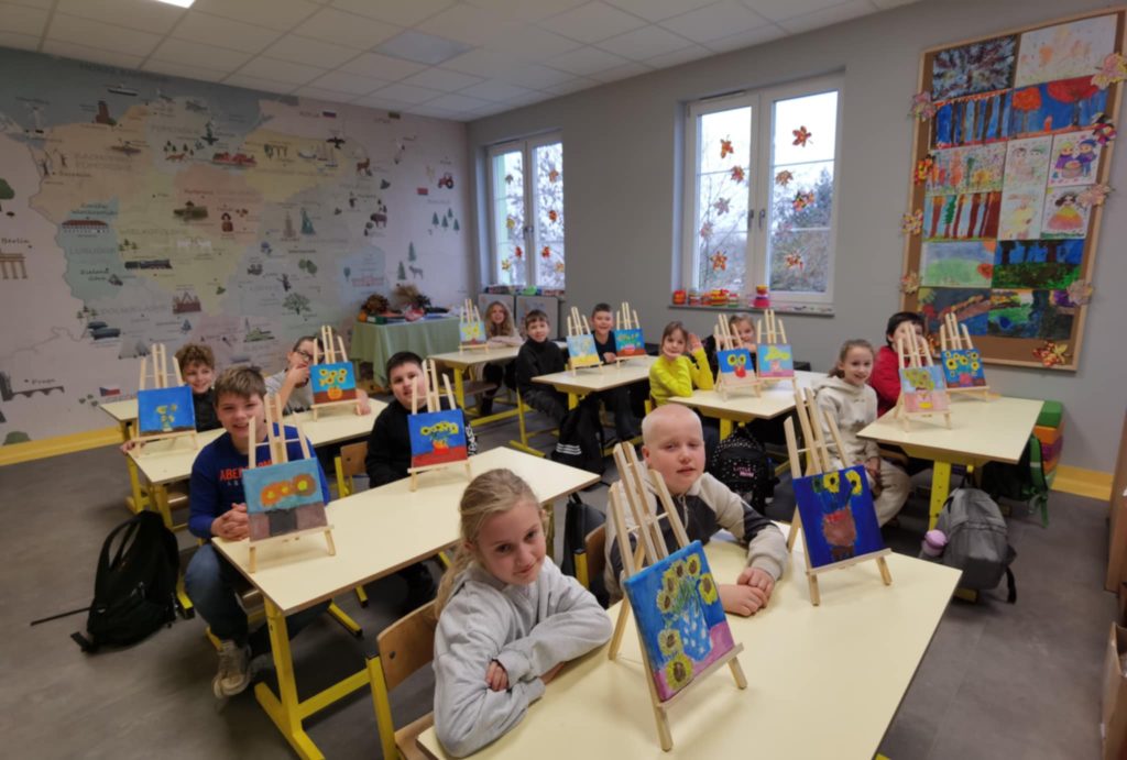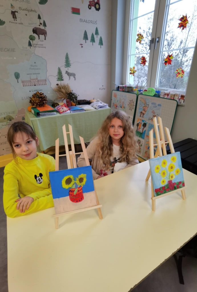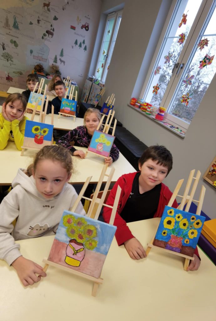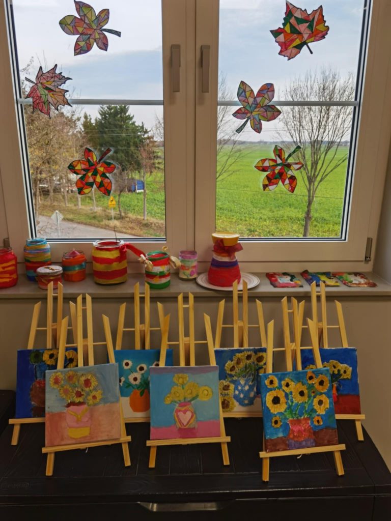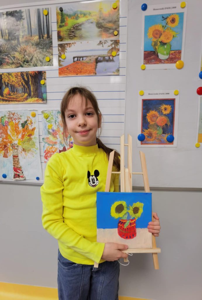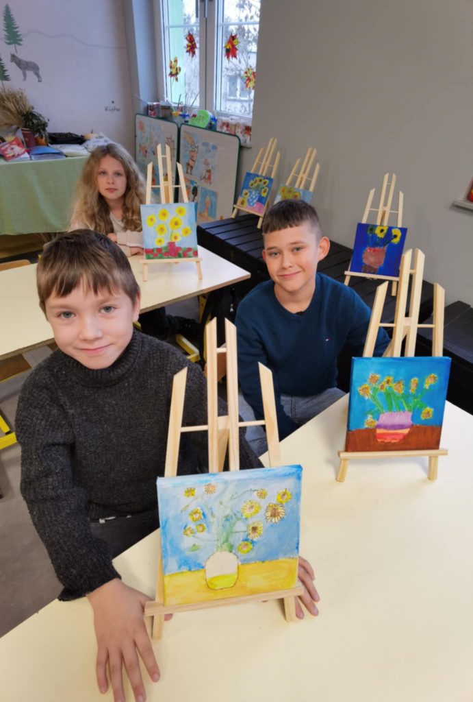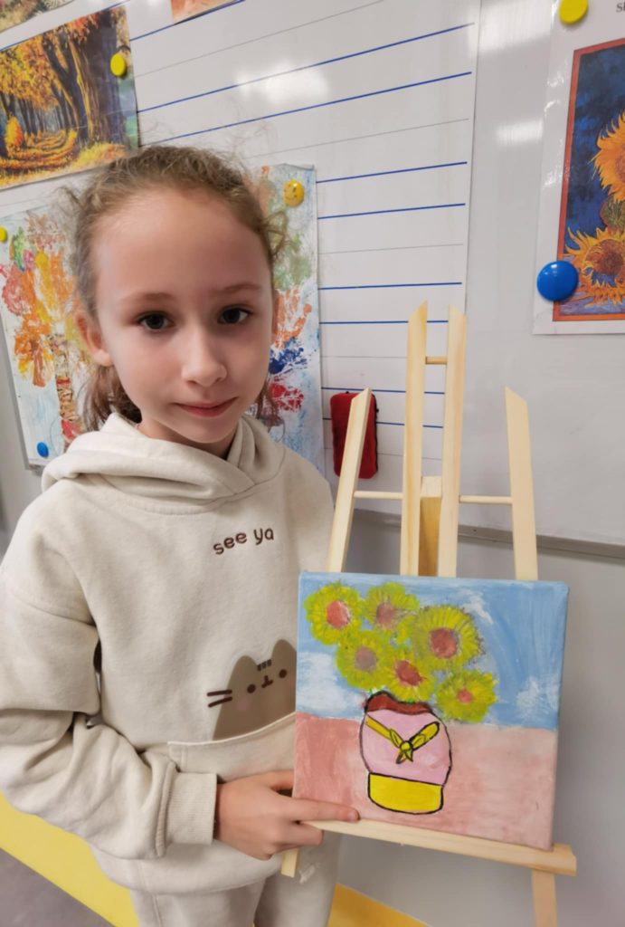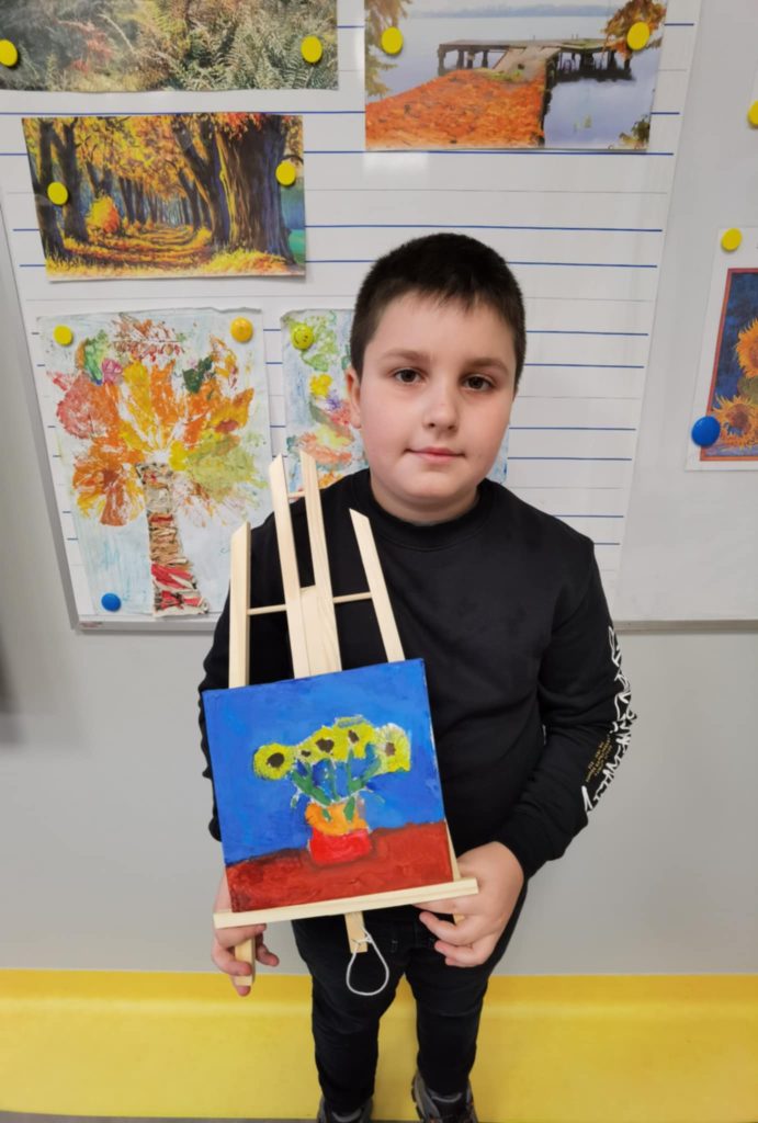Obrazy Vincenta van Gogha cieszą się ogromnym zainteresowaniem wśród trzecioklasistów, zwłaszcza ,,Gwiaździsta noc” oraz ,,Słoneczniki”. Uczniowie z wielkim zaangażowaniem i artystycznym rozmachem malowali na płótnie kompozycje kwiatowe wzorując się na słynnych ,,Słonecznikach” tego wielkiego malarza. Poprzez plastyczne działanie uczniowie wyrabiają nawyk dbałości o estetykę wykonanych prac, uczą się ich właściwego eksponowania. Zajęcia o charakterze artystycznym znacząco budzą wrażliwość estetyczną dzieci i umiejętność dostrzegania piękna w wytworach kultury, usprawniają manualnie, ćwiczą kreatywne myślenie celem rozbudzania ekspresji twórczej ucznia, wyrabiają umiejętność wyrażania swoich myśli i uczuć w formie prac plastycznych, wzmacniają wiarę w swoje możliwości. Każde dziecko przychodzi na świat z pewnym potencjałem uzdolnień. To od nas zależy, ile zrobimy by „oszlifować ten diament” i wyciągnąć z niego to, co najlepsze. Sztalugi i podobrazia zostały ufundowane przez panią Agnieszkę Musielę, której składamy serdeczne podziękowania!!!