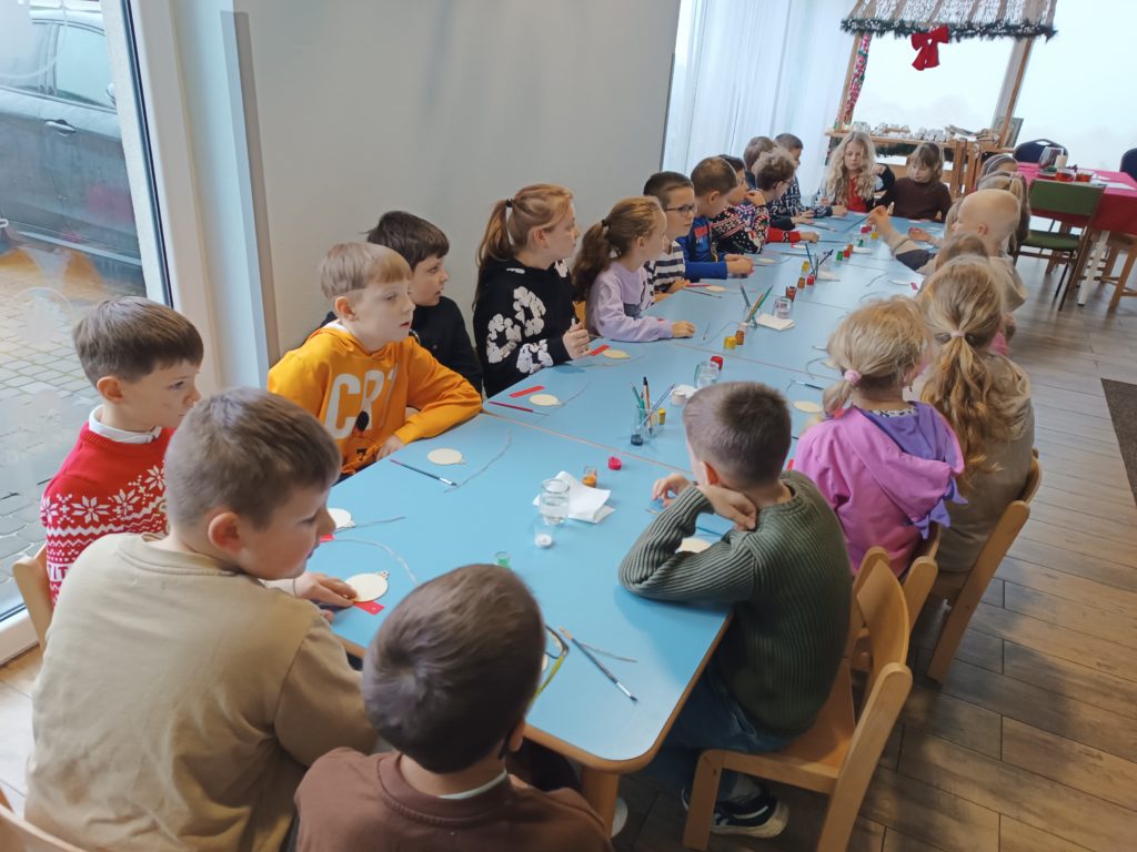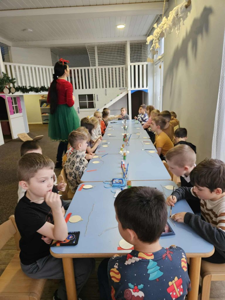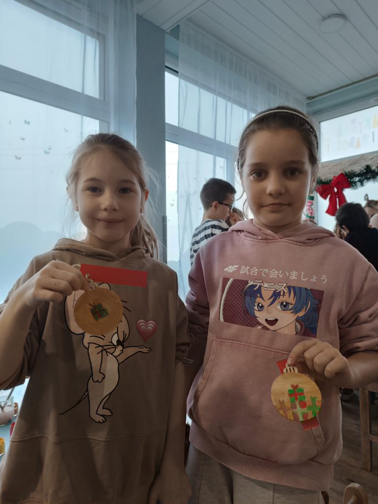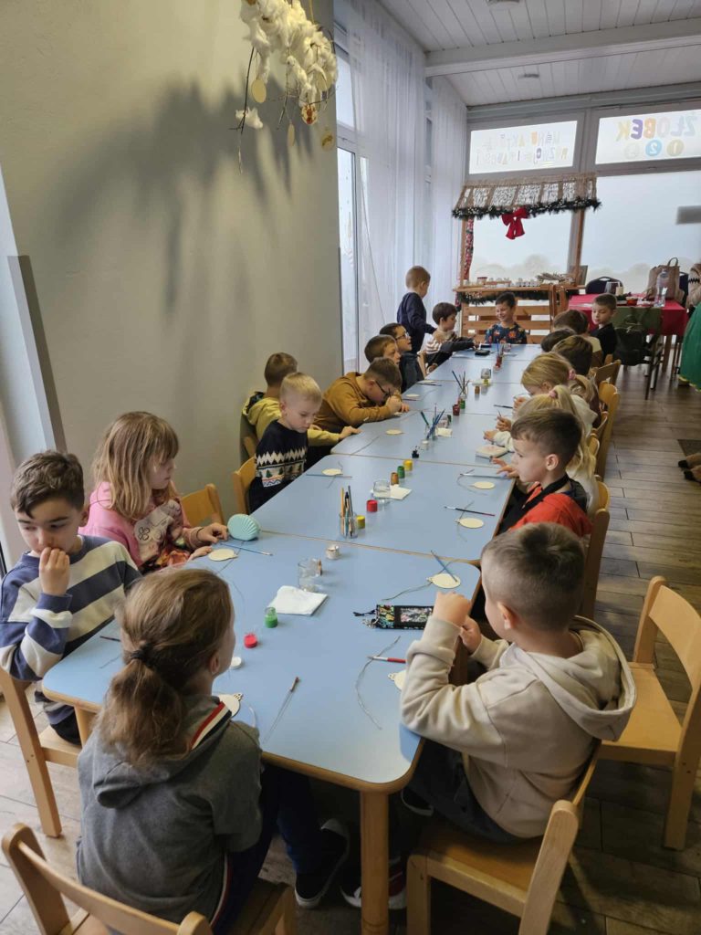 Pierwszym punktem wizyty były warsztaty plastyczne, podczas których uczniowie mieli okazję pomalować drewniane bombki. Dzieci ozdabiały je farbami, tworząc barwne i oryginalne wzory według własnych pomysłów. Po zakończonej pracy przyszedł czas na swobodną zabawę w bawialni, która dostarczyła wszystkim mnóstwo energii i radości.