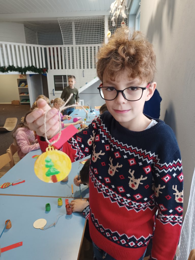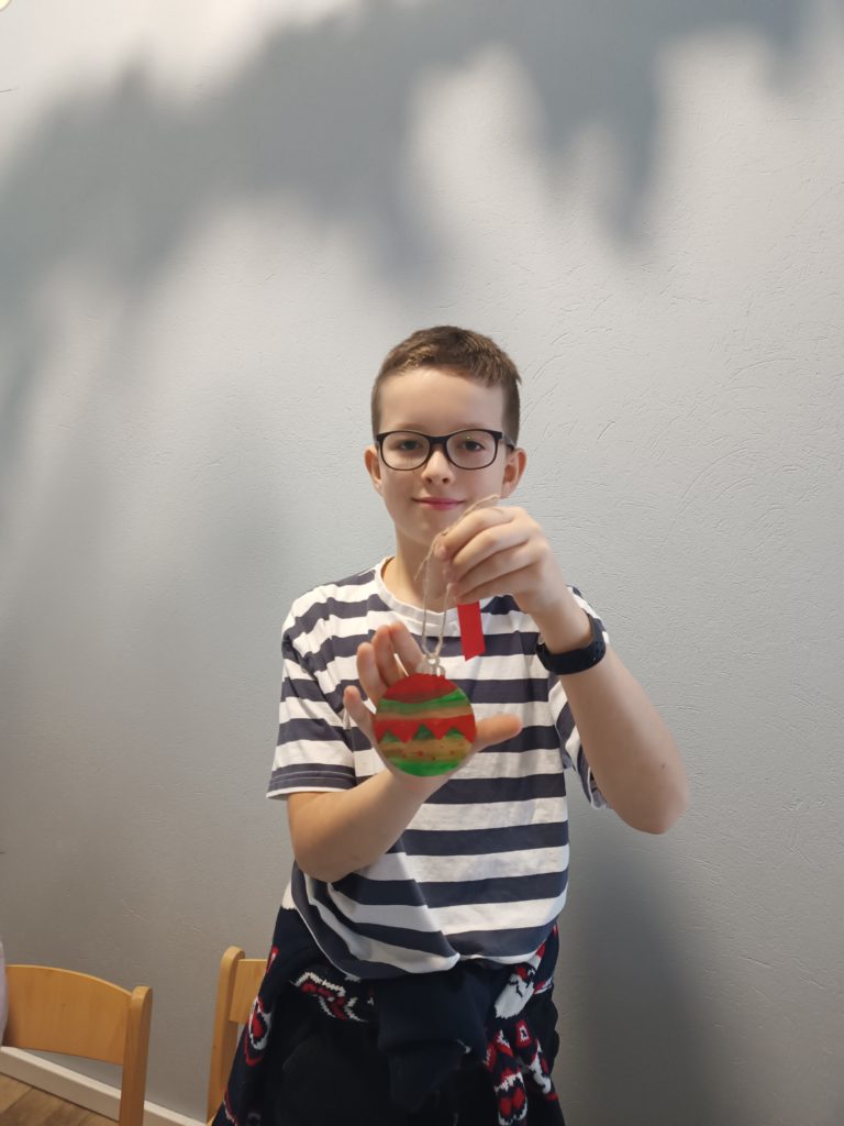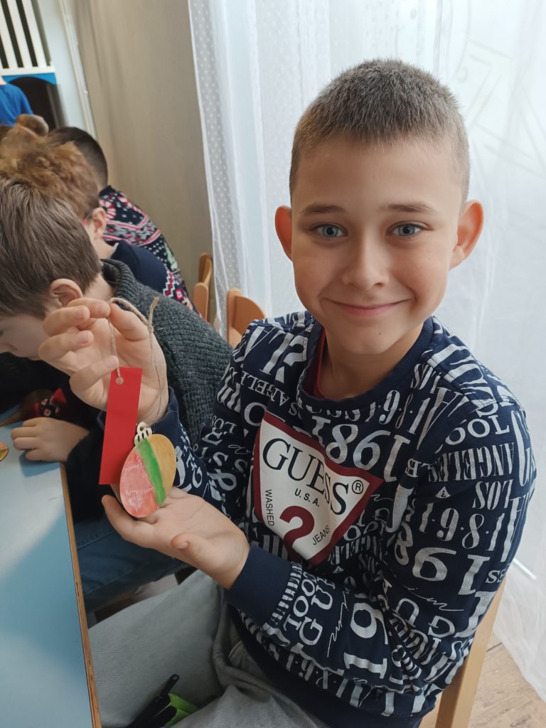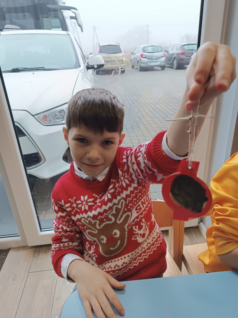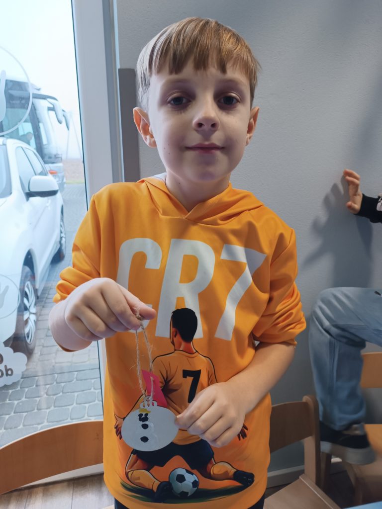 Pierwszym punktem wizyty były warsztaty plastyczne, podczas których uczniowie mieli okazję pomalować drewniane bombki. Dzieci ozdabiały je farbami, tworząc barwne i oryginalne wzory według własnych pomysłów. Po zakończonej pracy przyszedł czas na swobodną zabawę w bawialni, która dostarczyła wszystkim mnóstwo energii i radości.