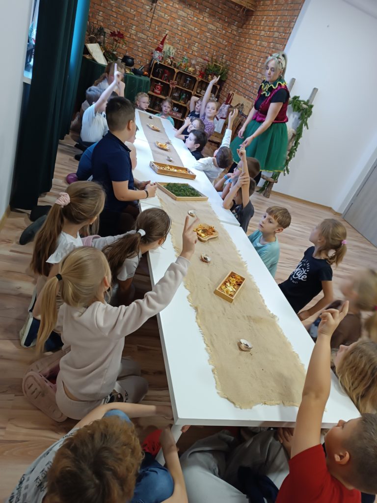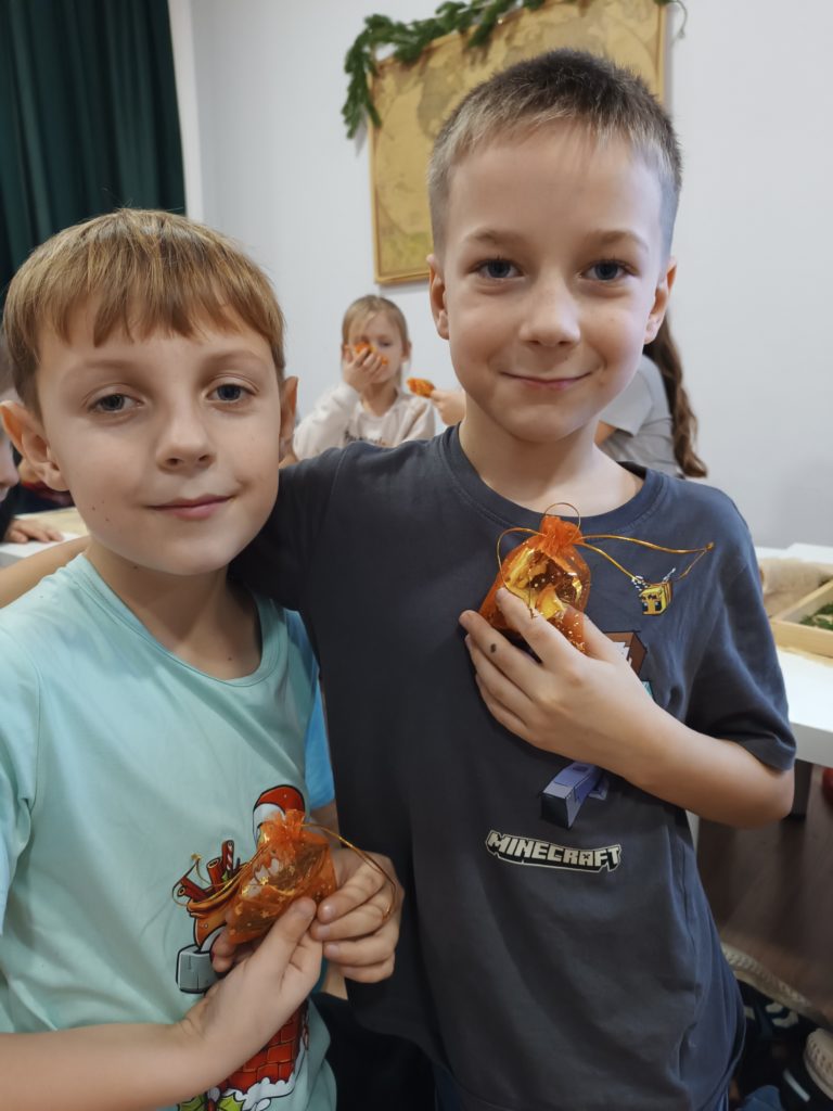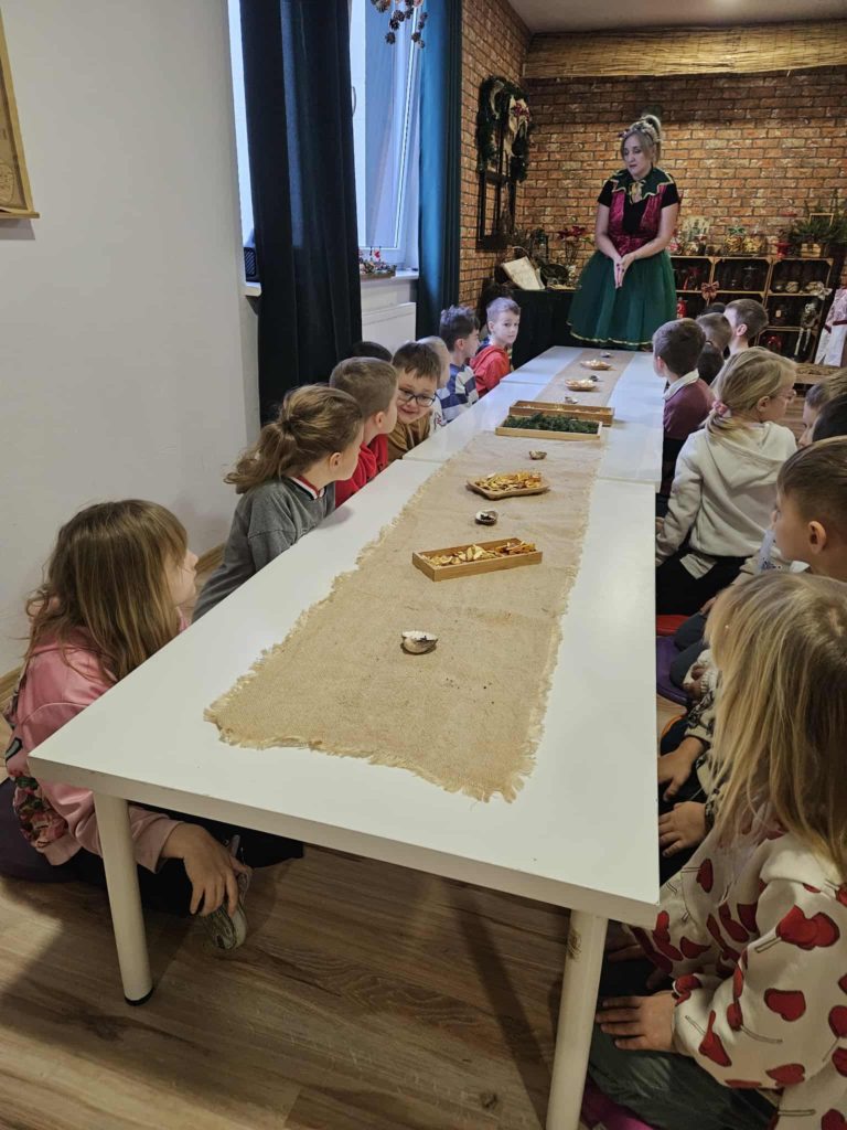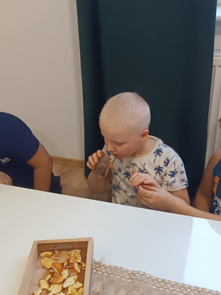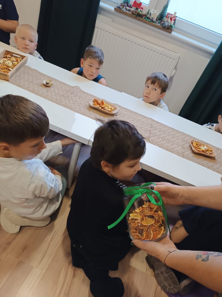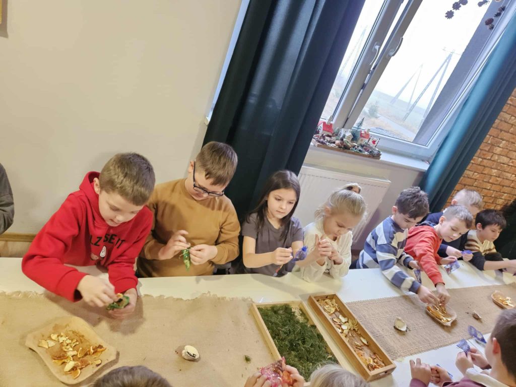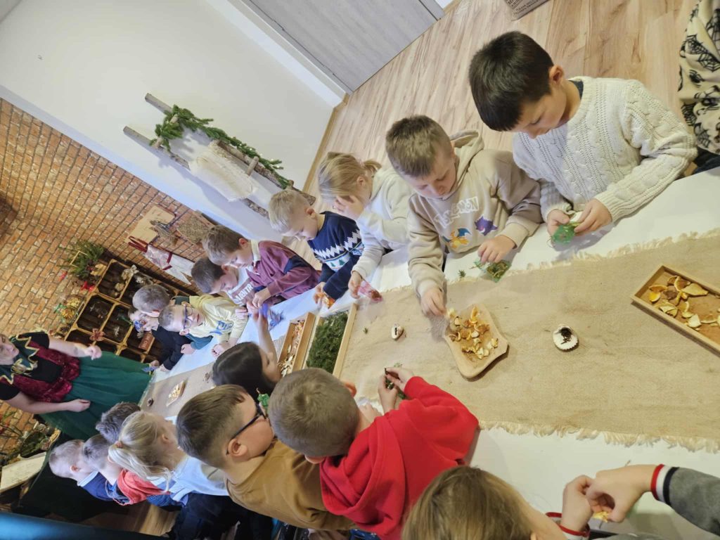 Kolejna część wycieczki przeniosła dzieci w świat zapachów zimy. Uczniowie przygotowali własne woreczki sensoryczne, wypełnione aromatycznymi skarbami grudnia. Wykorzystali do tego m.in. suszone pomarańcze, jabłuszka, cynamon oraz gałązki iglaste. Każdy woreczek pachniał inaczej, a wykonane kompozycje dzieci zabrały do domu jako pamiątkę.