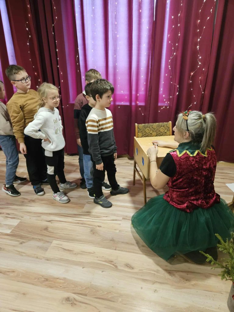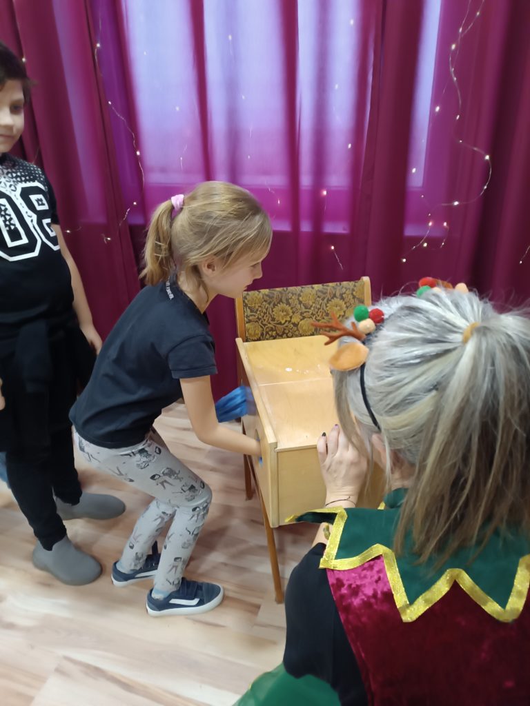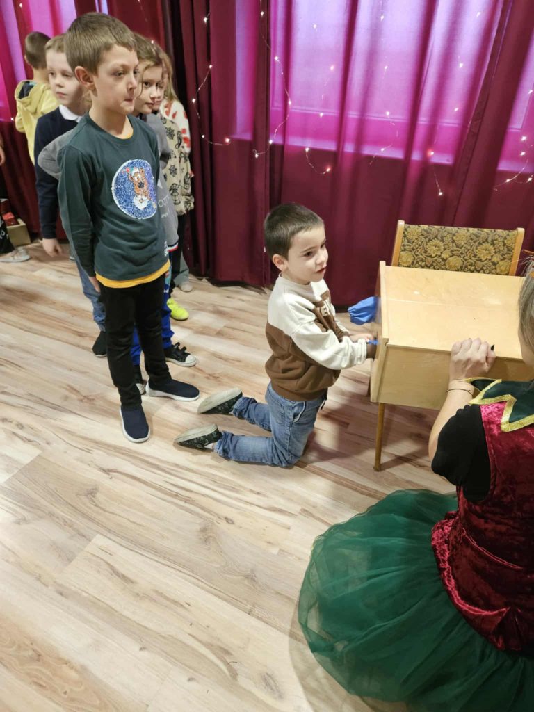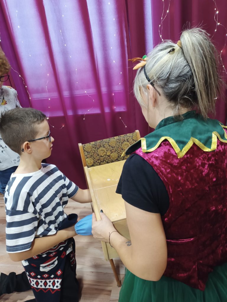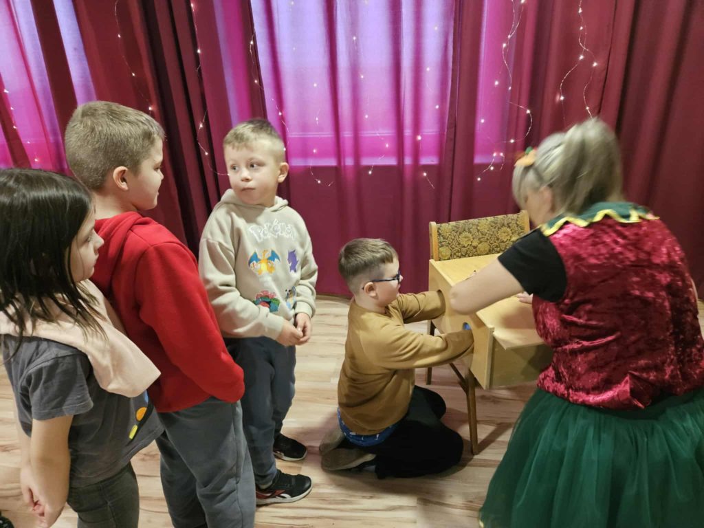 Następnie wszyscy zasiedli na miękkich poduszkach, by wysłuchać teatrzyku „Tajemnice świątecznych przepisów”, przedstawionego przez elfa. Po spektaklu dzieci wzięły udział w zabawie dotykowej, w której poprzez sam dotyk próbowały odgadnąć, co znajduje się w ukryciu. Zgadywanka wywołała wiele emocji i śmiechu. Ponadto odbyły się również zabawy ruchowe, które pozwoliły dzieciom pobudzić wyobraźnię, uwolnić energię i doskonale się zintegrować.