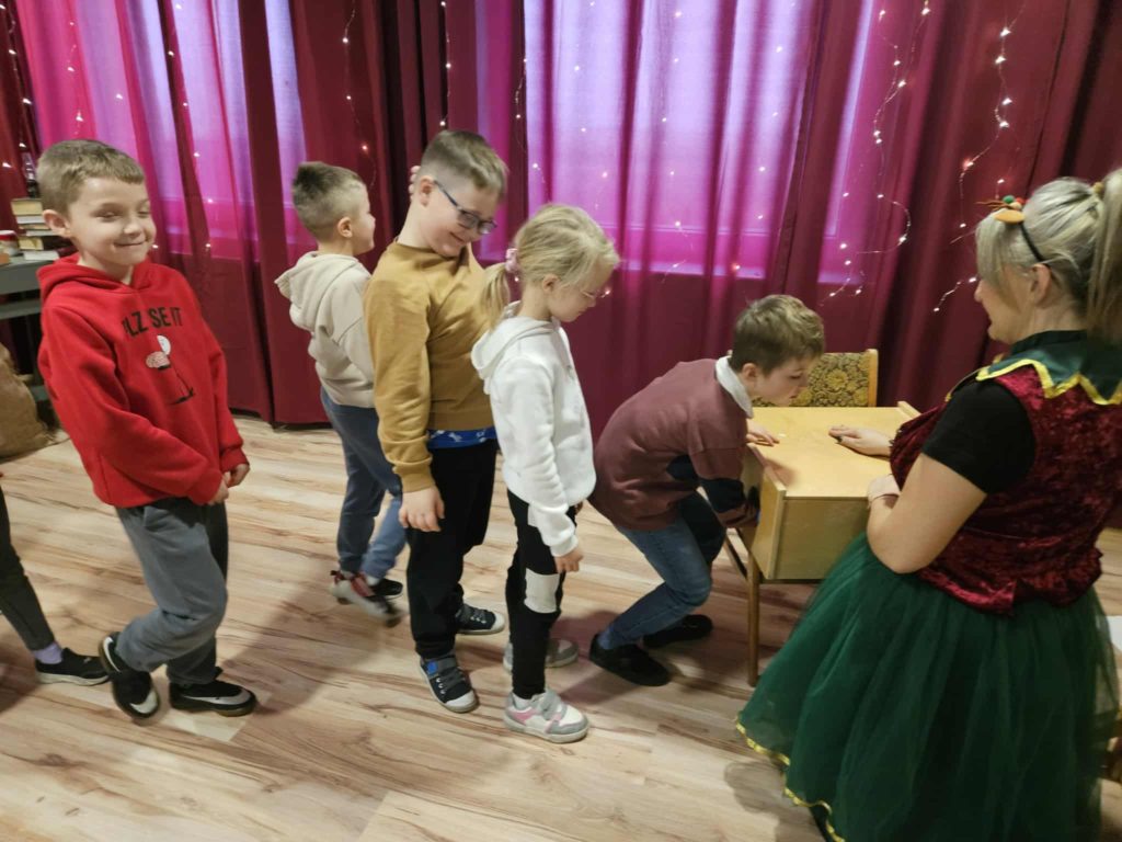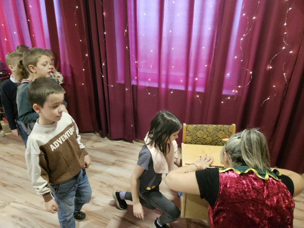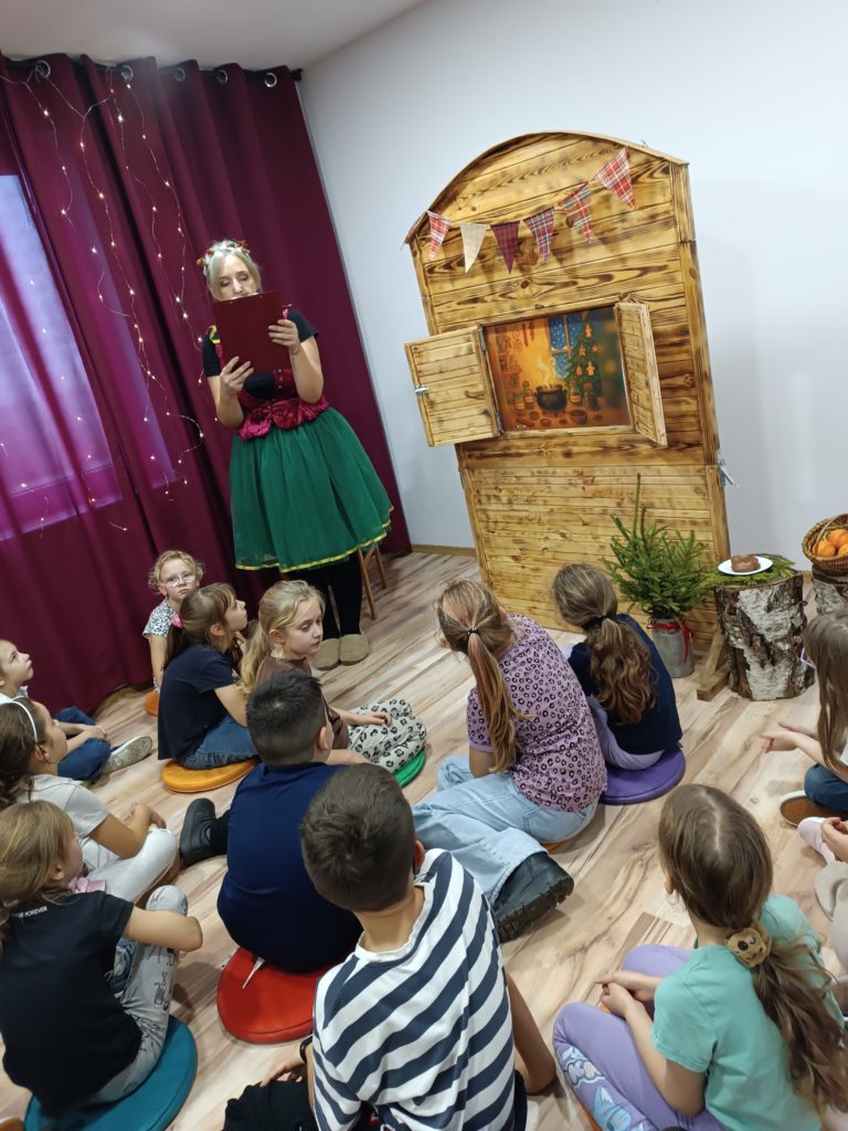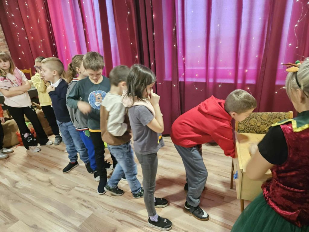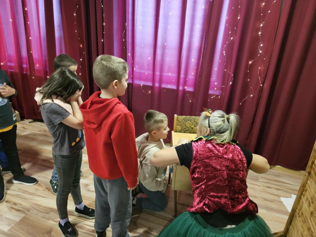 Następnie wszyscy zasiedli na miękkich poduszkach, by wysłuchać teatrzyku „Tajemnice świątecznych przepisów”, przedstawionego przez elfa. Po spektaklu dzieci wzięły udział w zabawie dotykowej, w której poprzez sam dotyk próbowały odgadnąć, co znajduje się w ukryciu. Zgadywanka wywołała wiele emocji i śmiechu. Ponadto odbyły się również zabawy ruchowe, które pozwoliły dzieciom pobudzić wyobraźnię, uwolnić energię i doskonale się zintegrować.