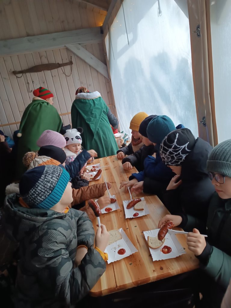 Ostatnia część wycieczki odbyła się na świeżym powietrzu, gdzie w specjalnie przygotowanym miejscu czekały na wszystkich pachnące kiełbaski z ogniska oraz ciepła herbata. Elf kontynuował zabawy muzyczno-ruchowe, tym razem również z wykorzystaniem instrumentów, co sprawiło dzieciom ogromną frajdę.