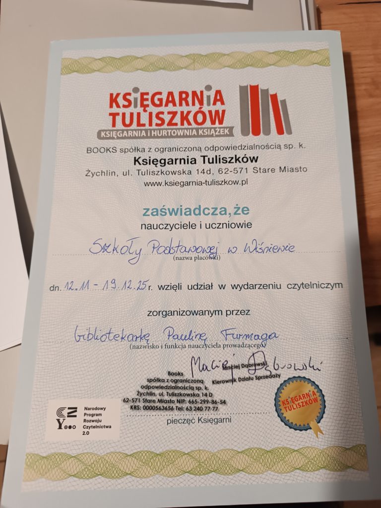 Udział w tym wydarzeniu został również doceniony poprzez otrzymanie dyplomu od księgarni, co stanowi miłe podsumowanie udanej współpracy.