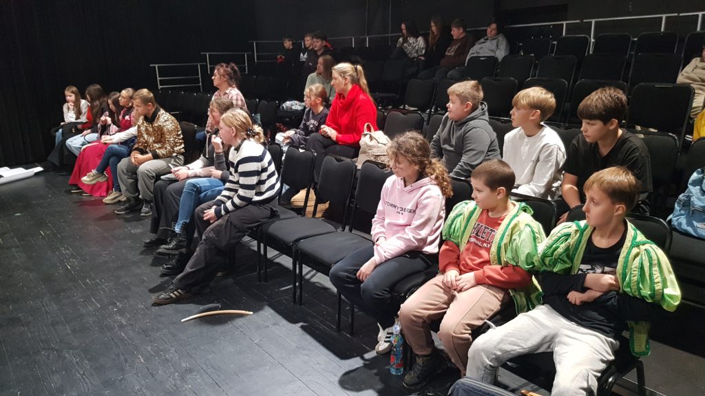 Zajęcia w teatrze wprowadziły nas w świat świateł, dźwięków i kolorów. Na początku wartszatów prowadzący zapoznał nas ze specyfiką funkcjonowania teatru. Wyjaśnił nam zasady działania teatru, czyli to, jak powstaje spektakl, kto w nim uczestniczy, jakie są jego funkcje oraz jakie osoby są za niego odpowiedzialne. Mieliśmy okazję posłuchać między innymi o tym, jak wygląda praca aktorów, reżysera, kostiumografa, czy technika.