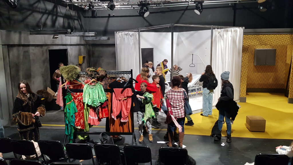 Zajęcia w teatrze wprowadziły nas w świat świateł, dźwięków i kolorów. Na początku wartszatów prowadzący zapoznał nas ze specyfiką funkcjonowania teatru. Wyjaśnił nam zasady działania teatru, czyli to, jak powstaje spektakl, kto w nim uczestniczy, jakie są jego funkcje oraz jakie osoby są za niego odpowiedzialne. Mieliśmy okazję posłuchać między innymi o tym, jak wygląda praca aktorów, reżysera, kostiumografa, czy technika.